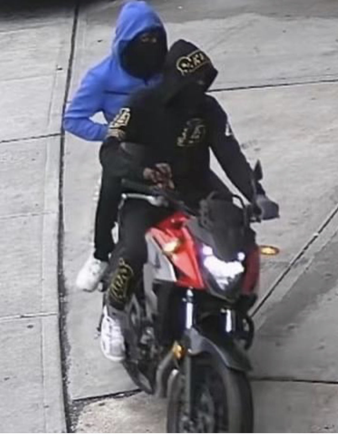 WANTED for a Robbery in front of 135 Cypress Avenue #Bronx @NYPD40pct on 7/21/23 @ 8:00 AM victim was approached by two individuals on a motorcycle who displayed a firearm and forcibly removed the victim’s chain from his neck. Reward up to $3500 Call 1-800-577-TIPS  Calls are CONFIDENTIAL!