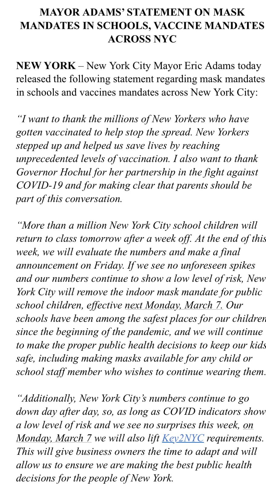 As for NYC, the Mayor announced if the data is declining, then the indoor mask mandate will be removed on March 7 for public schools. A final decision will be made on March 4 for that. The good news is indoor dining, fitness and entertainment venues involving Key2NYC will no longer need vaxx cards to enter effective March 7 in NYC.