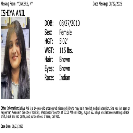 Ishiya anil missing from Yonkers