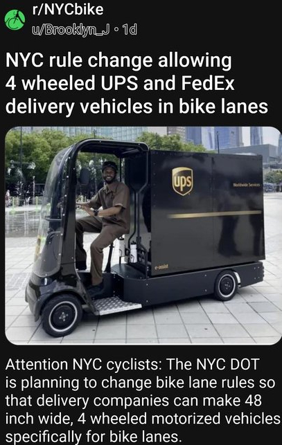 Electronic box trucks operated by UPS and others which cost around $20K are soon to have their way in the bike lanes once the measurements are set.