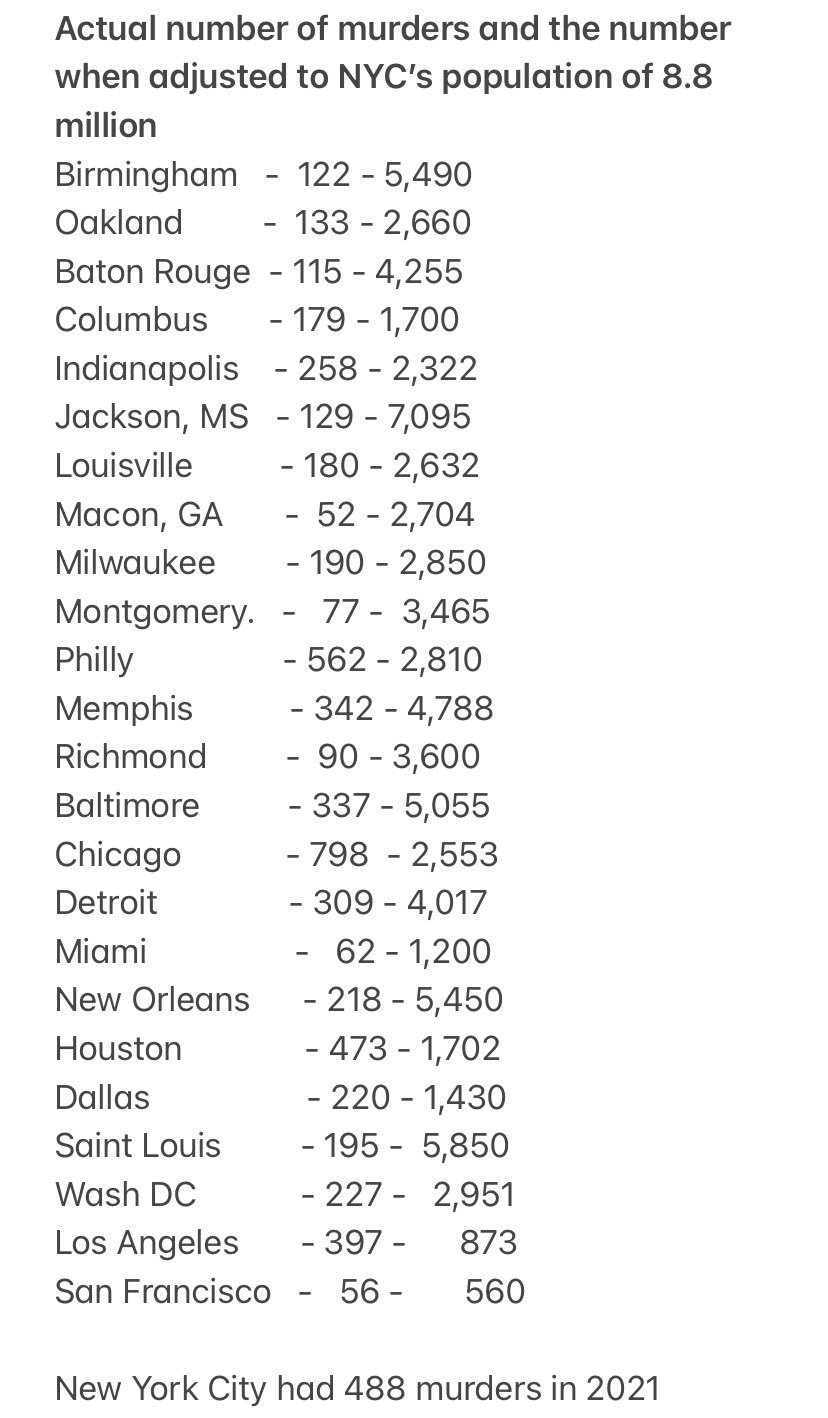 For 2021, 488 murders in NYC while Chicago the number uno had 798. That's 2 a day in Chicago and 1 a day in NYC for that year.