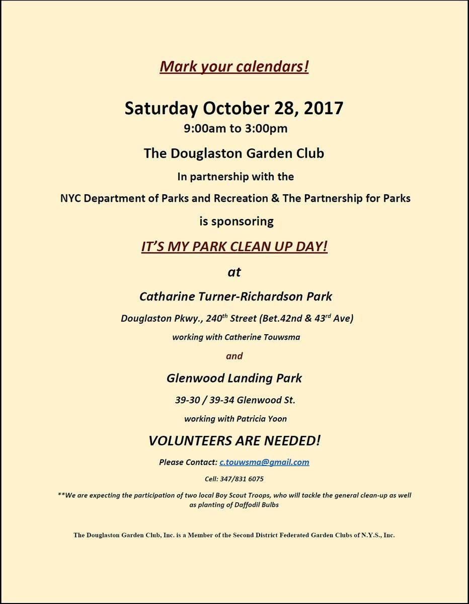 Saturday, October 28 from 9am to 3pm at two parks in Douglaston. Open to the public.