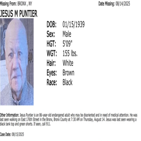 Jesus M Puntier, Male/Black/86 years old from The Bronx, NY. The missing may be in need of medical attention.