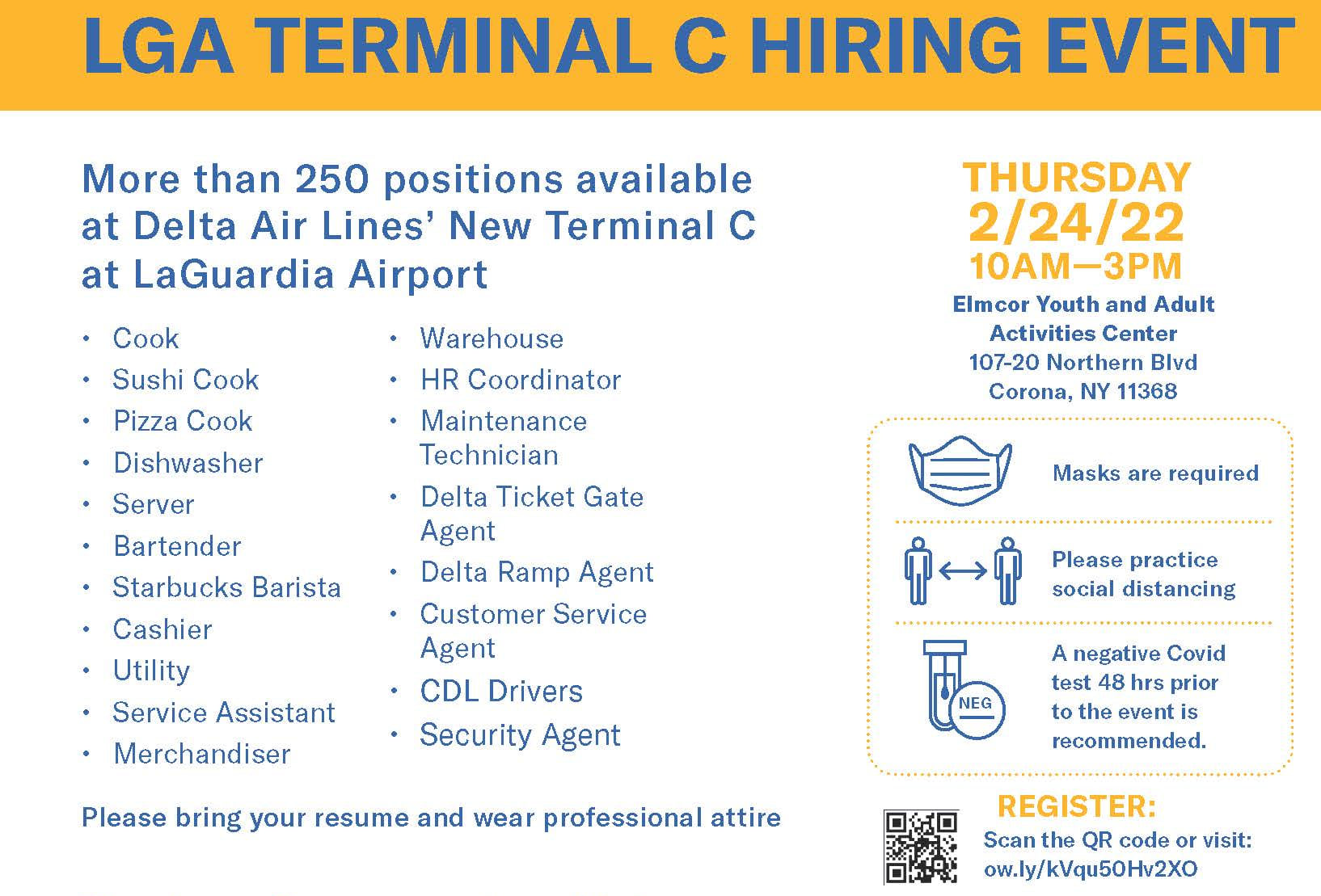 Thursday, February 24 from 10am to 3pm, LGA airport will have a job fair. This is at the Terminal C. Over 250 position available. Follow the rules listed. Proper attire and resume required. Open to the public.