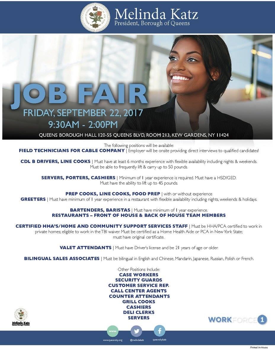 Friday, September 22 from 9am to 2pm. Open to the public. Bring plenty of resumes. 120-55 Queens Blvd. Walk-ins welcome but proper attire required.