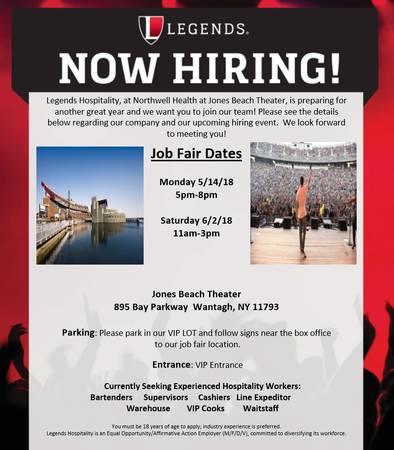 Monday, May 14 from 5 to 8pm and Saturday, June 2 from 11am to 3pm. Hiring Supervisors, Cashiers, Cooks, Bartenders and more. Jones Beach Theater, 895 Bay Parkway, Wantagh, NY. Open to the public.
