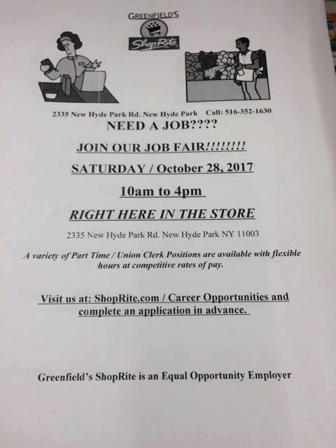 Saturday, October 28, ShopRite is having a job fair at 2335 New Hyde Park Rd in New Hyde Park from 10am to 4pm inside the store. Open to the public.