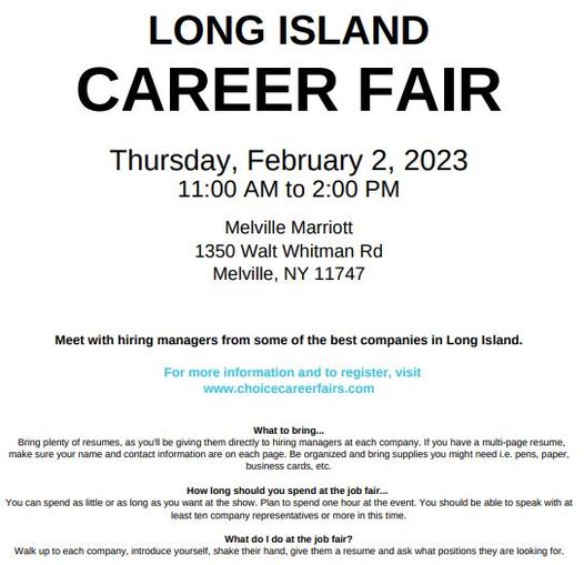 Thursday, February 2 from 11am to 2pm at the Melville Marriot, 1350 Walt Whitman Road in Melville.