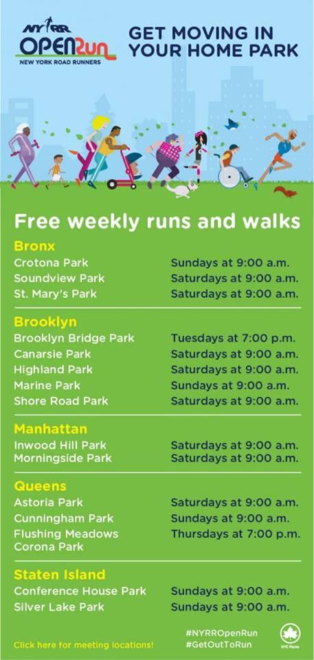 Saturdays 9am at Astoria Park, Sundays 9am at Cunningham Park and Thursdays 7pm at Flushing Meadows Corona Park. Open to the public. Details at this link, https://www.nyrr.org