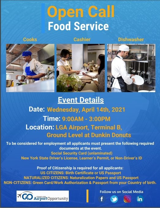 APril 14 from 9am to 3pm, LaGuardia Airport will have a job fair for food workers. At least 50 positions are available. This is for the newly built terminal as the first phase of job fair. More job fairs will be announced soon. This event is open to the public. It's at Terminal B. ID and proof of citizenship are required for all applicants.