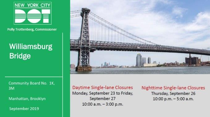 Frm September 23 to 27, between 10am to 3pm, one lanes will be closed on Williamsburg Bridge. September 26, one lane closure between 10pm to 5am. This is due to maintenance work.