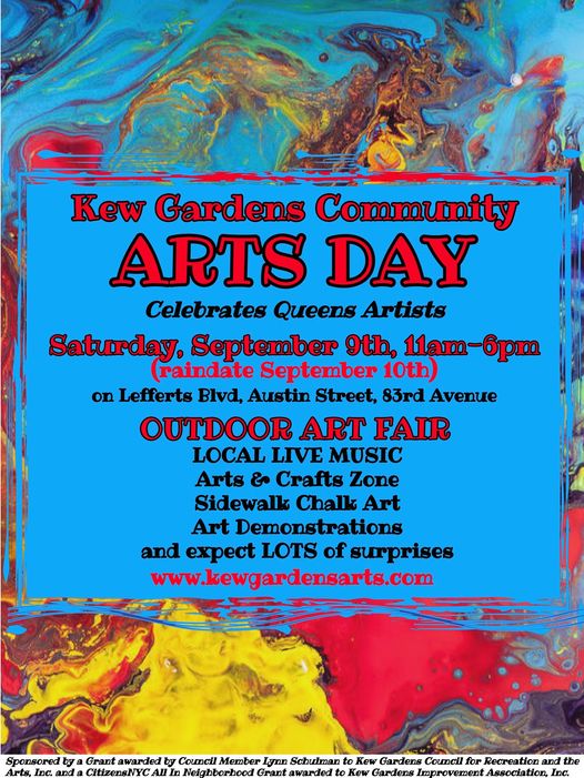 On September 9 in Kew Gardens Arts Day on Lefferts Blvd from 11am to 6pm.
