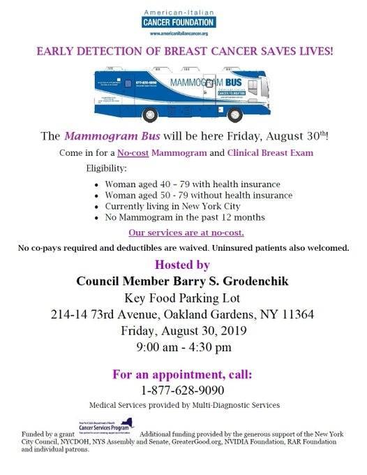 Friday, August 30 from 9am to 4:30 at the parking lot of Key Food in 214-14 73rd Avenue in Oakland Gardens. Open to the public.