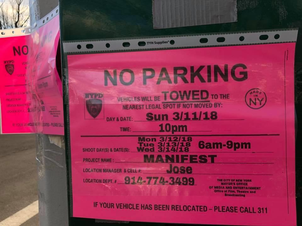 Union Turnpike in both directions between Springfield Blvd and Bell Blvd scheduled to film, Manifest on March 12 to 14. Vehicles are not allowed to park.