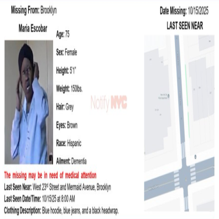 Maria Escobar, female/hispanic/75 from the area of West 23rd Street and Mermaid Avenue in Brooklyn. The missing has dementia & may need medical attention.
