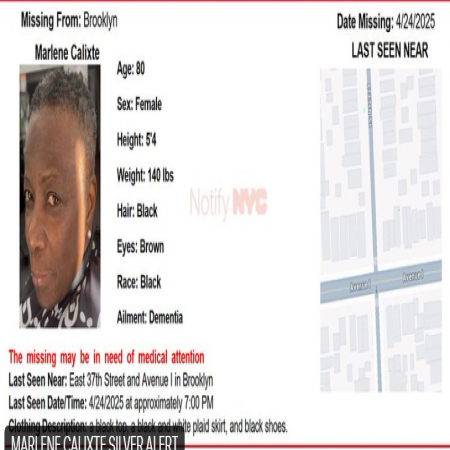 Marlene Calixte, F/B/80 from East 37th Street & Avenue I, Brooklyn. Marlene has dementia and may be in need of medical attention.