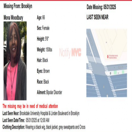 Mona Woodbury, F/B/66, from Chester Street & Riverdale Avenue, Brooklyn. The missing has bipolar disorder & may need medical attention.