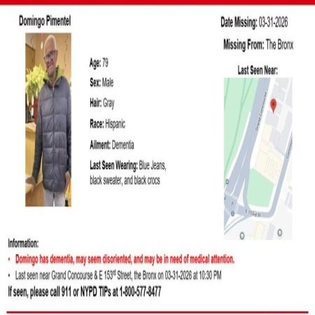 Domingo Pimentel, Male/Hispanic/79. Last seen near Grand Concourse & E 153rd St, The Bronx. Domingo has dementia, may seem disoriented, & may need medical attention.