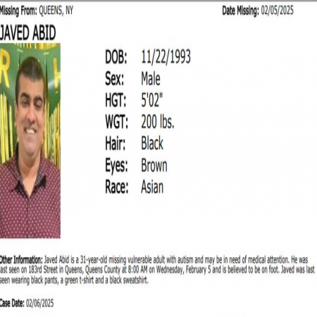 Javed Abid, Male/Asian/31 from Queens, NY. The missing has autism & may be in need of medical attention.