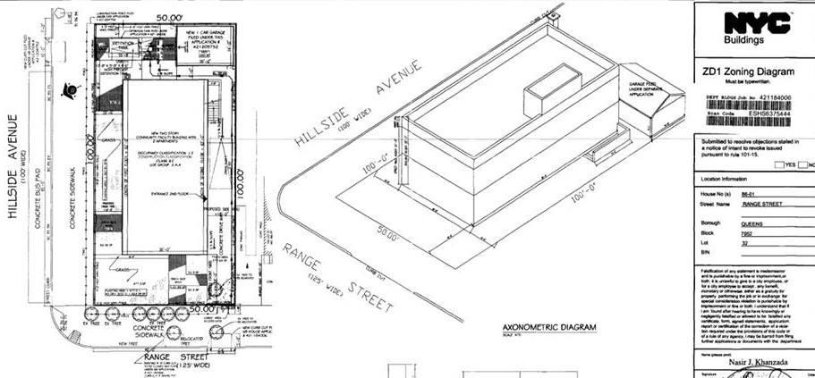 The location, 86-01 Range Street which is on the corner of Hillside Avenue near Winchester Blvd will be a two story building with mixed use according to NYC Dept of Building. The owner, Syed Hossan ran out of money to continue with construction after buying the previous home. Although permits were filed for a commercial lot but weren't complete. Now the lot has been refiled to use the ground floor as a Bangaladeshi community center to operate a non-profit center welcoming donations from the public. The second floor will be used a residential as per zoning. A time frame for completion has not been disclosed. pic by NYC DOB.