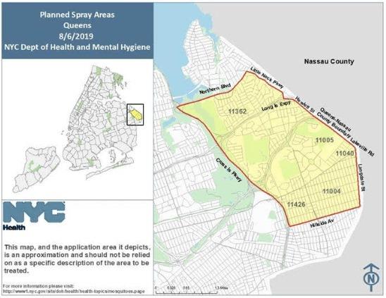 August 6 between 8:30 p.m. and 6 a.m. in these locations, Bellerose Manor, Douglaston, Glen Oaks, Little Neck, Auburndale, Bay Terrace, Beechhurst, Clearview, College Point, Fort Totten, Linden Hill, Malba, Whitestone. Zip codes: 11004, 11005, 11040, 11354, 11356, 11357, 11358, 11359, 11360, 11362, 11426. Details at this link, https://www1.nyc.gov/?/downloads/pdf/wnv/2019/wnv-notice-20?