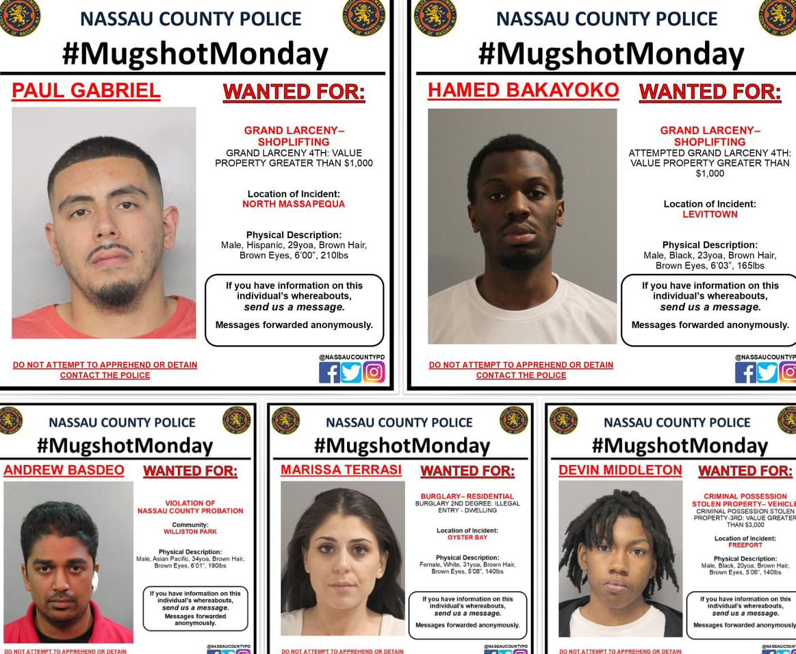 NCPDMugShotMonday: Pictured subjects are wanted Felony and Misdemeanor criminal offenders who reside in or have committed crimes in Nassau County. These individuals have been arrested for the listed crime(s) and then failed to appear in court and/or follow the mandates of their release. If you have information on the pictured individuals, send us a message or give us a call Messages and calls can be forwarded anonymously.