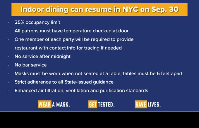 NY governor announced in a press brief today NYC indoor dining can start on September 30 at 25% capacity. Restrictions will also be applied from mask when not siting to social distancing. No bar service.