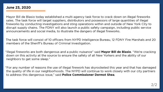 Mayor de Blasio announced a new task force to crack down on illegal fireworks. This announcement came after group of people went to Gracie Mansion protesting to the mayor at night demanding action. Around 40 law enforcement officers will act as undercover buyers as part of the sting operation to target people coming from out of state with fireworks selling in NYC. Fireworks are legal to purchase in some parts of NJ and all of Pennsylvania. The mayor also stated a public safety campaign to educate the people of the dangers of fireworks toward the youths. Between June 8 and 15, there were 1,680 complaints on fireworks from 311 compared to 12 in 2019. The mayor stated the focus is on the bigger operations and not focused on the kids on the corner quoted, ?We?re focused on the people that are really profiting and really distributing a lot of fireworks.?
