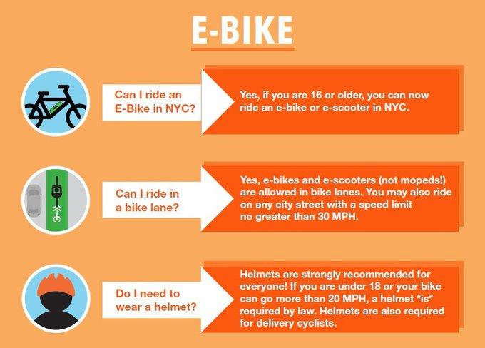 On Monday, NYC allowed all e-bikes and e-scooters in NYC. This is for class 1 to 3. The bike lanes are designated for that use and not sidewalks. For e-bikes, no registration or license required. The same with e-scooters. Details at this link, https://www1.nyc.gov/html/dot/html/bicyclists/ebikes.shtml