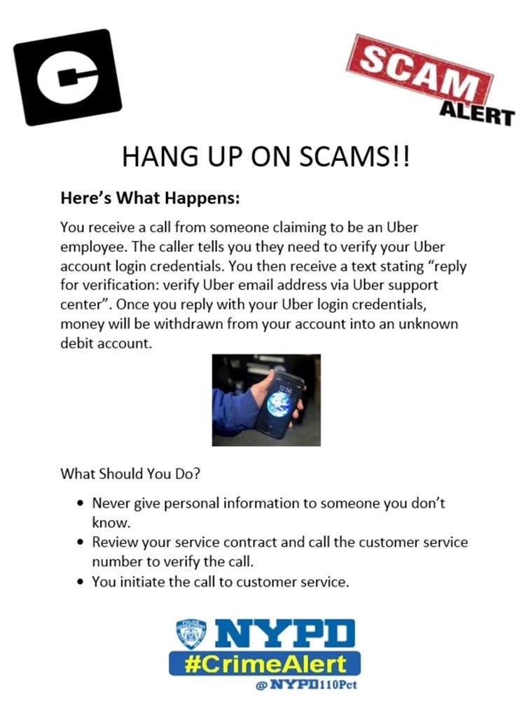 Police reported a new scam using Uber when someone calls pretending to be from the original company asking for credentials. The company does not call its account users and advising all to be cautious of the new scam. NYPD reported a large group of account holders were scammed.