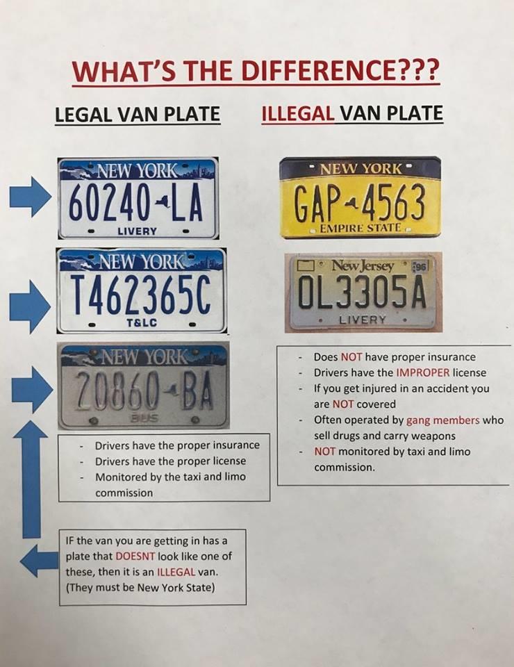 NYPD released info of comparison between legal and illegal van plates operating out in NYC of passenger pickups. The main message is that illegal van plates are often operated by gang members and carry weapons.