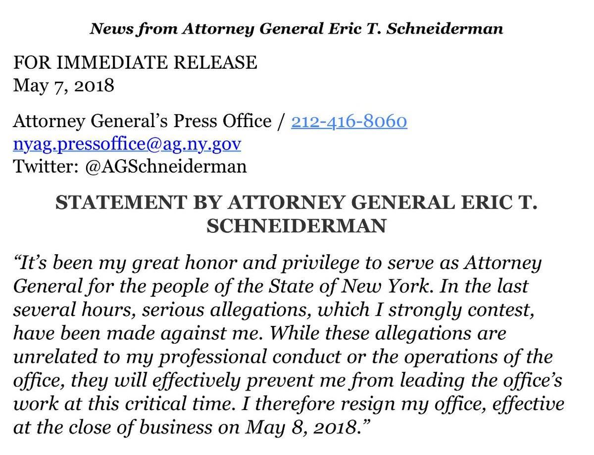 One of New York's most powerful man quit on Monday night after several woman reported of sexual allegations. Eric Schneiderman announced on Monday at 10pm of his resignation. A new Attorney General will be nominated by both NY State Senate and Assembly pending outcome of the election. The Manhattan DA's office is conducting an investigation.