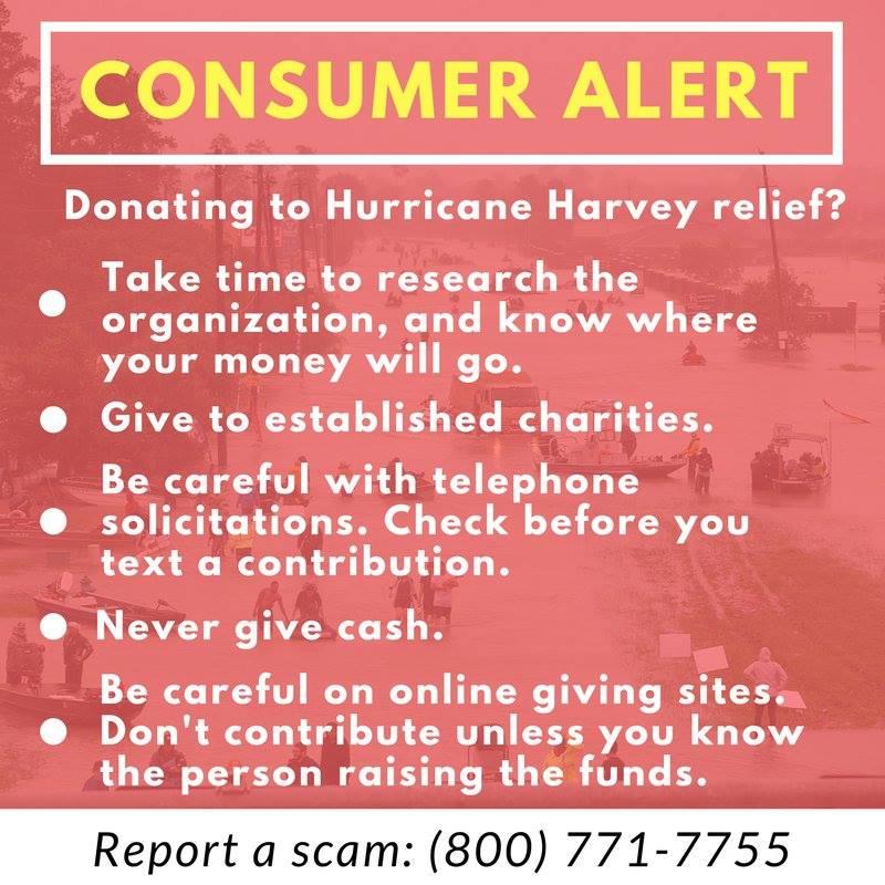After Hurricane Harvey, NYS Attorney General reported a rise in scam with people calling from claimed accredited organization soliciting money. The best way to prevent scam is to collect the number and name of person calling along with what organization they are with. Once collected, call the organization's main number and verify for authenticity.