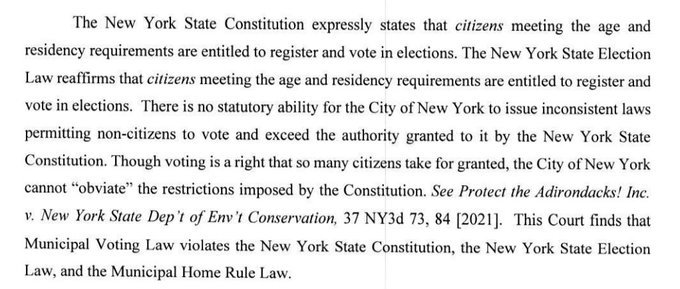 The NYS court overseeing the right for all to vote in the NYC election has struck down applying to only citizens.