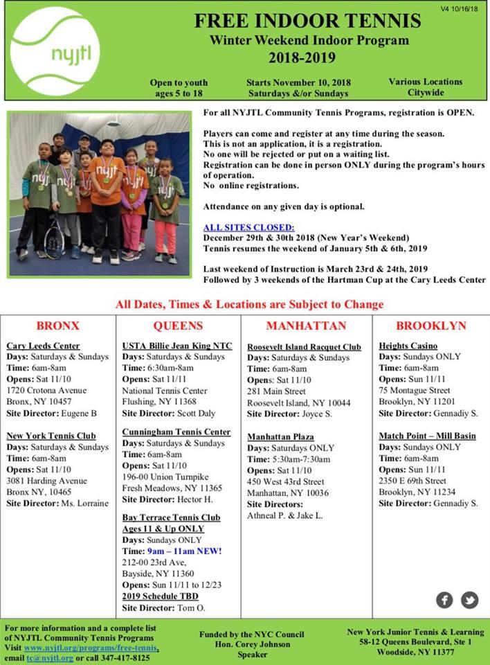 Hosting free, indoor, weekend tennis in your borough until March of 2019.