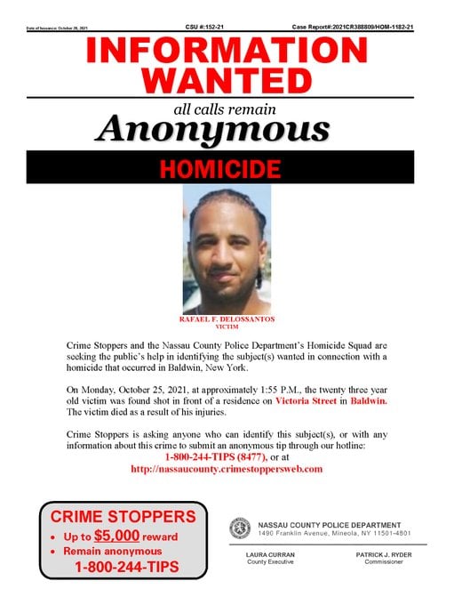 The NCPD stated they have no leads to the homicide in Baldwin so far. Today, they released press info asking for the public's help to solve the crime. The incident was reported on October 25 at 1:55pm when a victim was gunned down. Any information can help to solve the case.