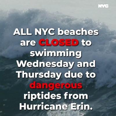 Due to Erin, the hurricane passing by, all NYC beaches will be closed Wednesday and Thursday, that's tomorrow and the day after tomorrow. The Mayor's Office confirmed park officials will be on patrol also and no lifeguards on duty.