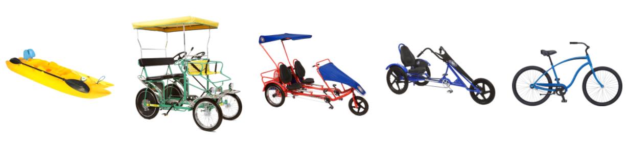 Beside bikes, specialty cycles, kayaks, pedal boats, and more.