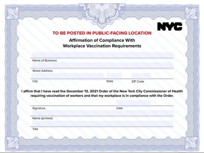 All businesses in NYC must display the new certificate on the front for the public of compliance with the jab.