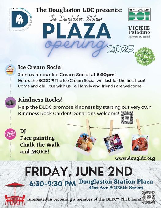 Friday, June 2 from 6:30pm to 9:30pm at the Douglaston Station Plaza, 41st Avenue and 235th Street will have ice cream social, face painting, chalk the walk and more.