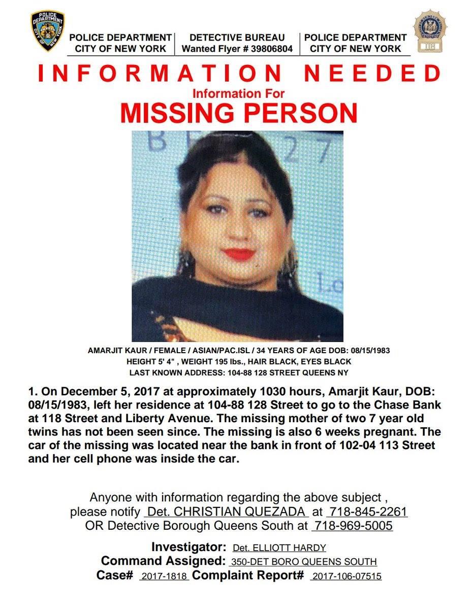 Police are reporting a missing woman, Amarjit Kaur from Ozone Park since December 5. Kaur's vehicle and phone found from the place she was seen last.