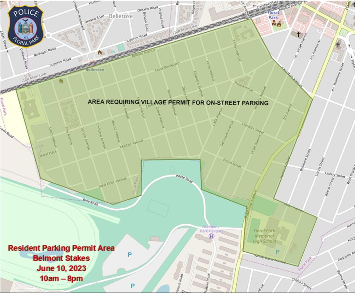 RESIDENT AND GUEST PARKING PERMITS FOR BELMONT STAKES DAY - All residents of the area noted on the map below are advised that ALL VEHICLES PARKED ON VILLAGE ROADWAYS IN THIS AREA WILL REQUIRE A PARKING PERMIT on Saturday, June 10th, 10:00 a.m. – 8:00 p.m.