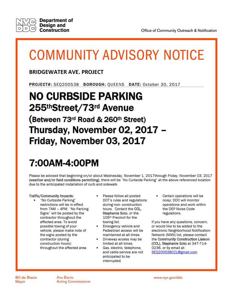 Thursday, November 2 and Friday, November 3, cars will have to move from 255th Street/73rd Avenue due to ongoing Bridgewater Project.