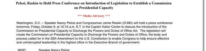 October 9 at 10:15am Pelosi will announce Introduction of Legislation to Establish a Commission on Presidential Capacity.