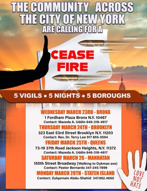 The communities across the city are gathering in five boroughs starting today to promote love over hate. For that, today will be held in the Bronx so please no bullets are to be fired from guns for a few hours. Tomorrow is Brooklyn and Friday is Queens in Jackson Heights which reported the highest people with bullets lodged inside. Saturday in Manhattan and Sunday are off so bullets can fly. Then Monday into Staten Island. Last weekend, 29 people had bullets inside and Monday more people received the same while lying down in the hospital in stable conditions.