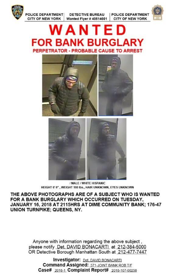 The incident happened on Tuesday, January 16 after 8pm at the Dime Bank on the corner of Utopia Parkway and Union Turnpike.