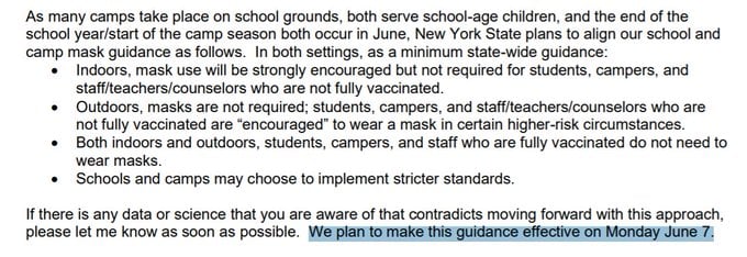 Today, the NY governor issued a press statement to the public after a long weekend with a newly tanned face. The governor stated when the vaxxies hit 70%, the remaining RONA restrictions will be lifted. He is guessing by the first week of July even though the standing is now at 68.6%. It was 64.6% last Thursday so reaching 70% is a slow pace to celebrate Independence Day to let all know he accomplished his mission. Coming to the school mask mandate, there was so much confusion. Indoor mask mandate will remain in effect in schools. It's up to each school to decide despite there being emergency school board meetings over the weekend. One district went remote and another called snow day over mask mandate. What the governor doesn't tell you is that CDC only recommends and doesn't need to follow it so NY can do what it wants. However, CDC recommends a mask mandate for the school year 2020 to 2021. As of this week, NYS received a small amount of $264 million from the fed to continue with the vax efforts.