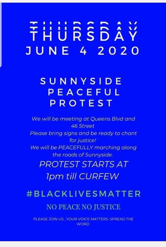 The protest started after the meet on Queens Blvd and 46 Street in Sunnyside. The protest started at 1pm and will continue until curfew. NYPD advise drivers to avoid Queens Blvd, Roosevelt Avenue and its vicinity. This is organized by local city council member who represents the district demanding the defund of NYPD.