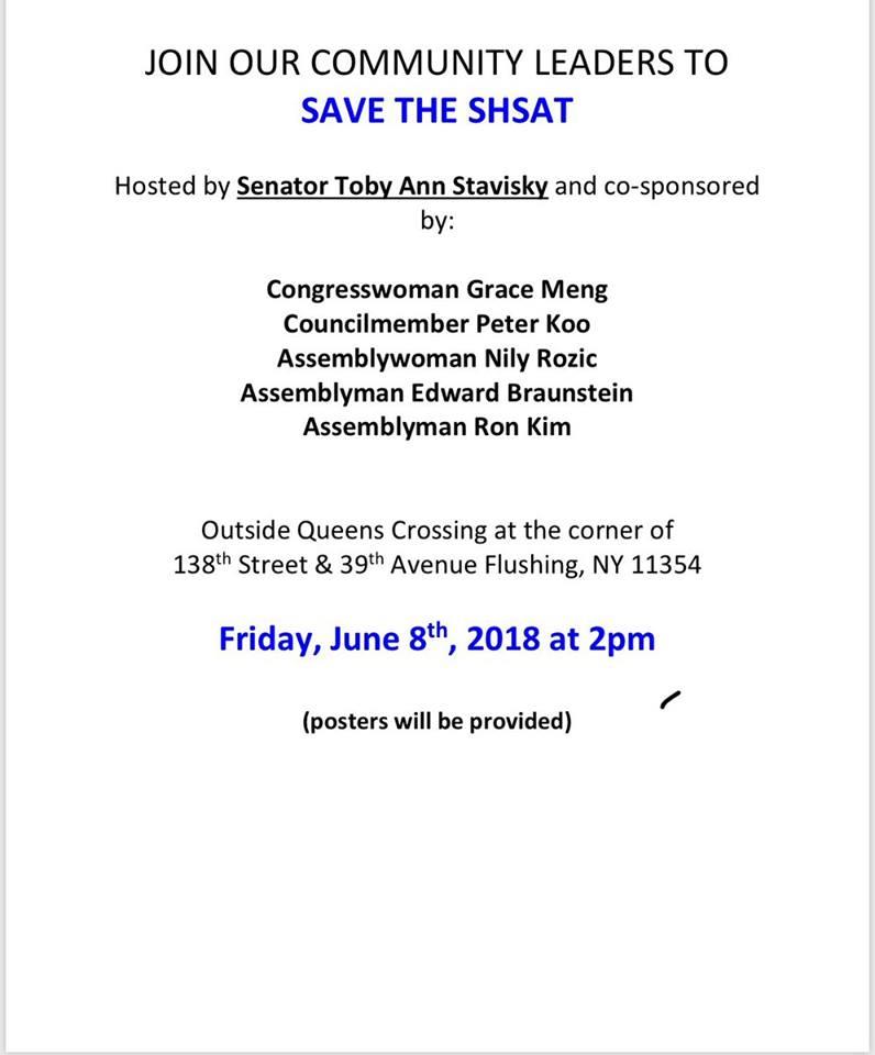 Queens local politicians and parents are angry at Mayor di Blasio to eliminate Specialized High School Admissions Test (SHSAT) which is for elite schools in NYC such as Bronx School of Science and Stuyvesant High School. A protest is scheduled on Friday in Flushing. Open to the public. However, the bill will not take place this year due to limited deadline with NYS who decides the decision. The NYS Education Committee passed the bill for next year which the Governor will decide. If SHSAT is scrapped altogether, then the entire NYC public school admissions will be the same. Many teachers at specialized schools are already considering to quit their jobs if the bill is passed. There are total of 8 elite schools in NYC.