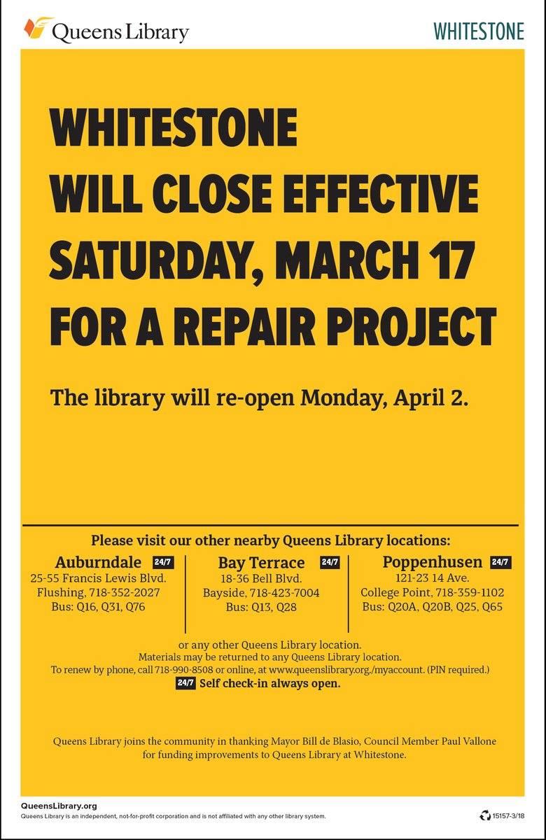 Starting March 12, the public library at Whitestone will be closed for renovations. It will re-open on April 2 for the public.